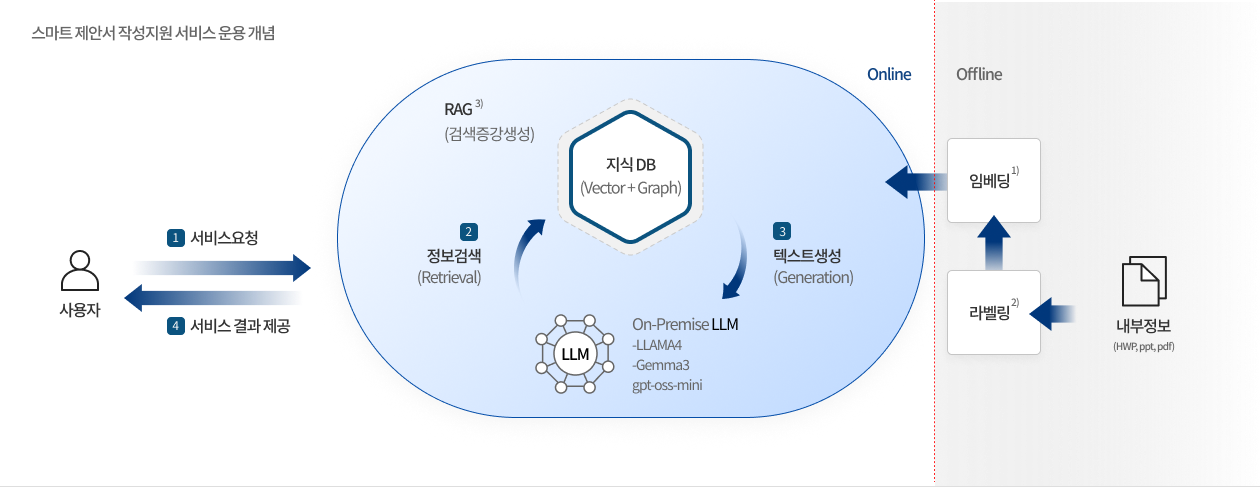 - 회사별 정보 기반으로 생성형 AI 기술을 활용하여 컨텐츠 검색 및 생성 서비스를 제공